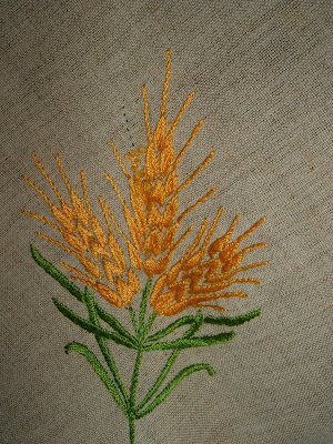 Si tratta di una tovaglietta in lino ecrù di circa 120 x 100 cm che presenta un solo lato disegnato con un greca piuttosto complicata e solo parzialmente ricamata in azzurro e giallo oro. Nei due angoli dello stesso lato sono presenti le spighe, che vedete sopra ricamate in verde e giallo oro, e un fiore stilizzato color giallo oro e azzurro.