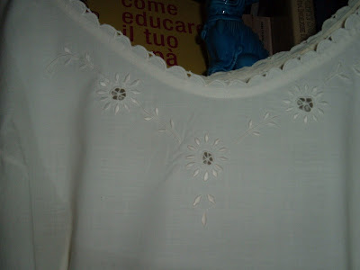 Per la verità la zia Adelaide che conservava la"biancheria di famiglia", non aveva più camicie da notte, diventate un decennio prima sottogonne per le mie cugine, ma solo quelle dette "da giorno". Queste erano meno elaborate delle precedenti (sopra si vede il semplice ricamo dello scollo) e perciò, secondo la moda di ...enta anni fa, meno grintose.