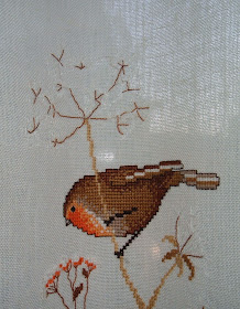 Ne ho trovato un surrogato. Pettirossi in punta d'ago, altrettanto graziosi, in memoria di quelli che animavano il giardino davanti a casa: sono diventati due tendine ed una tovaglietta invernali.