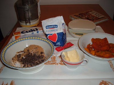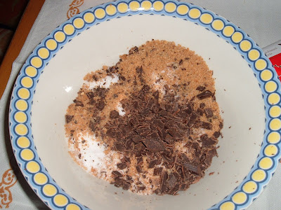 Ho mescolato allo zucchero 100 g di polvere di mandorle (al posto del cioccolato), aggiunto gli amaretti tritati e seguito lo stesso procedimento del composto precedente. Lo stampo si è riempito sino all'orlo.