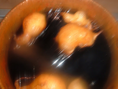 Quando sono cotte da un lato, queste frittelle, si rigirano da sole nell'olio bollente. Per lasciare loro lo spazio necessario ne friggo solo 5-6 per volta.