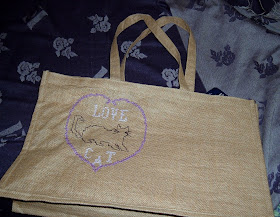 Era il ricamo perfetto per personalizzare la borsona di iuta, l'ultima di una serie acquistata per sostituire le buste fuorilegge.