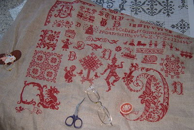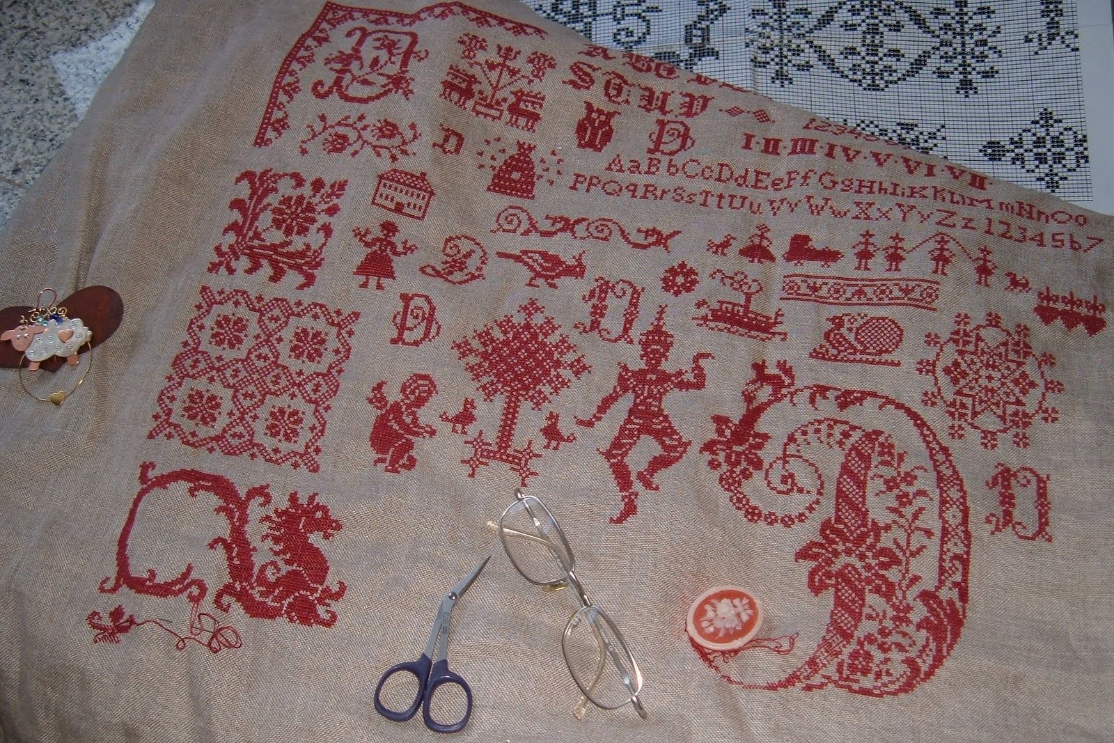 Questo è il risultato della prima tappa del Sal delle "Crocettime fuggiasche". Non è avanzato poi molto rispetto all'inizio. Ho aggiunto qualche piccolo dettaglio, Il drago e la "D" gigante che è poi il centro del sampler.