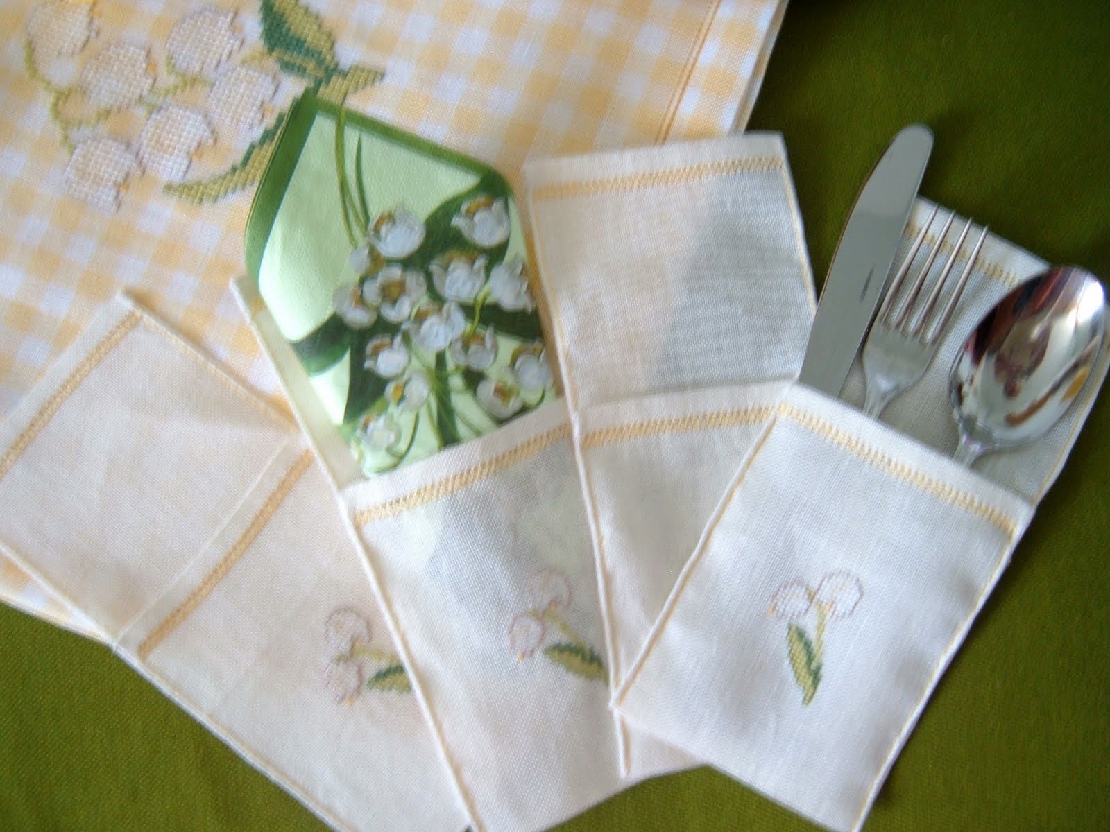 Ed ecco che un mazzetto di mughetti a punto croce ha trovato posto sulla tovaglietta realizzata con lino Graziano e sui portaposate abbinati.