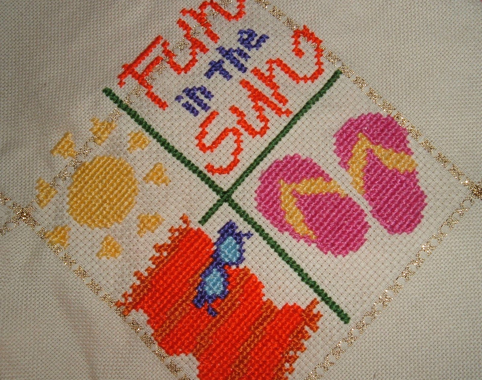 Qui sotto quando da me inviato a Gabriella, "la variazione sullo schema", appunto. Un piccola borsa, pensata per accogliere schemi, tessuti, fili da ricamo, che la accompagnerà durante le