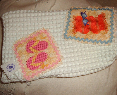 La pochette a nido d'ape con le applicazioni LK, crocettate su lino, conteneva vere chicche: bottoncini e spillini in fimo, passamanerie varie, filati da ricamo e una utilissima mascherina da refrigerare e applicare sugli occhi stanchi per il tanto cucire.