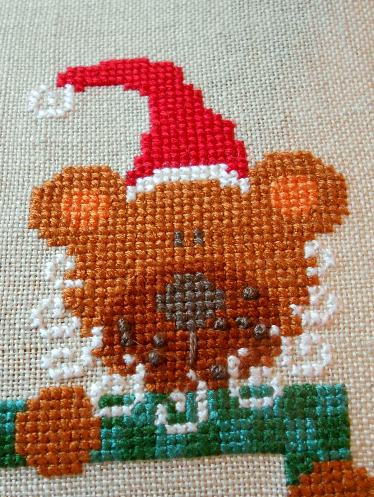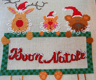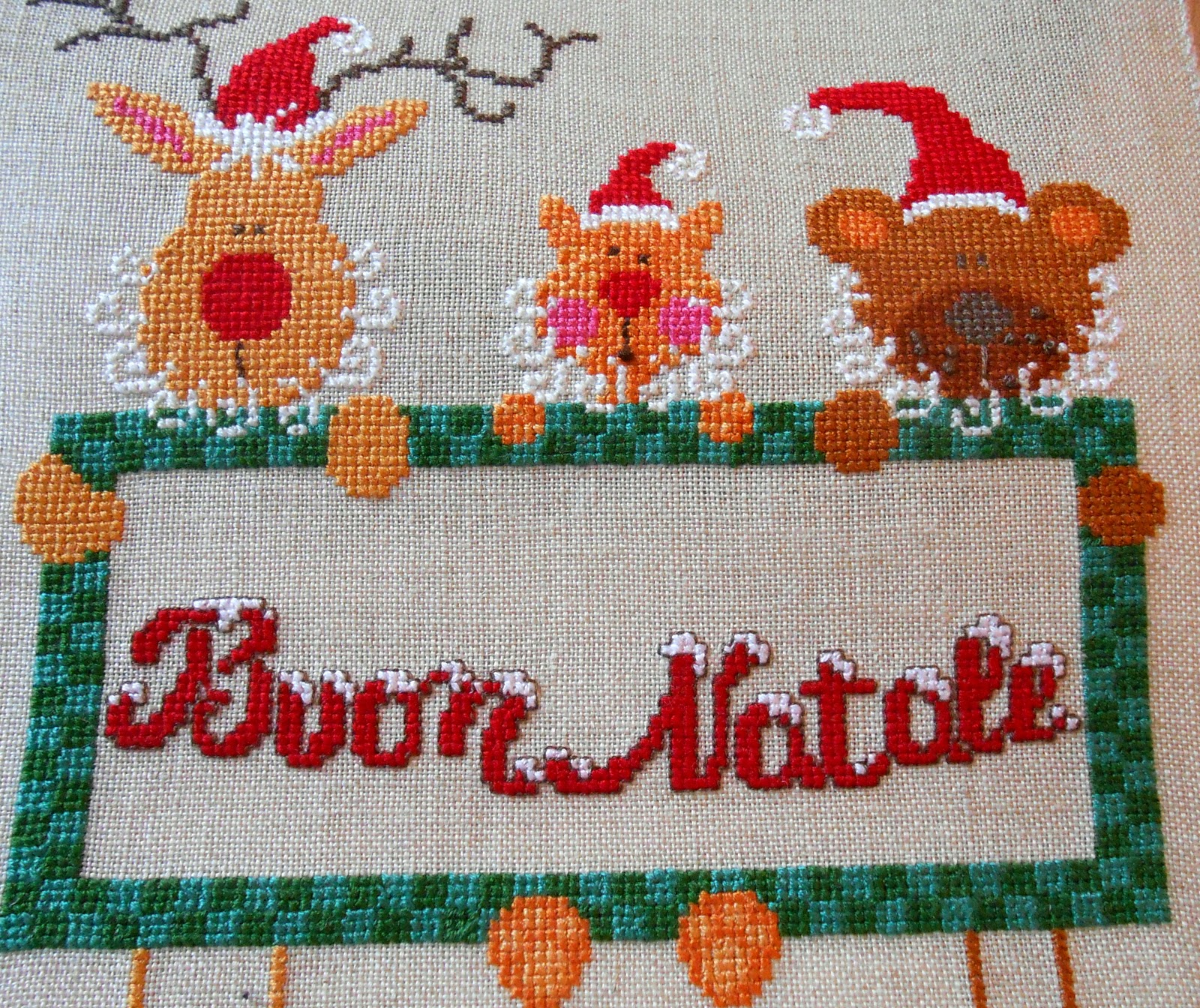 Quando alcuni anni fa mi hanno dato lo schema di questi animaletti una renna, un gatto e un orso, travestiti da papà Natale ho pensato che dovevo ricamarli; quest'anno l'ho fatto e il quadretto sarà il regalo per una ragazza che colleziona renne e adora tutti gli animali. Ho modificato la scritta originale del cartellone, che i furbetti sorreggono, per inviarle anche gli auguri.