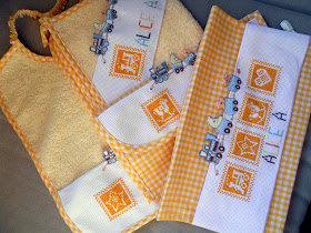 Set bavaglino, bustina porta bavaglino, asciugamano, sacchetta porta sciugamano: La Chiocciolina. Schemi: Lizzy Kate "Oh baby!". Filati: mouliné DMC n. 742, n. 840, n. 3075, n. 3823, n.402, n. 381. Trenino: L'albero dell'olivo - Pitigliano (GR).