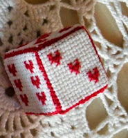 Niente di più appropriato per un passatempo, in cui i dadi sono essenziali, che segnalini a cubetto (2 cm di lato). Questi sono ricamati su Aida 72 fori con colori DMC; gli schemi con i cuoricini e le note musicali sono free di Frimousse (che ne offre tanti, tanti davvero graziosissimi), mentre gli altri soggetti sono miei adattamenti per il poco spazio a disposizione.
